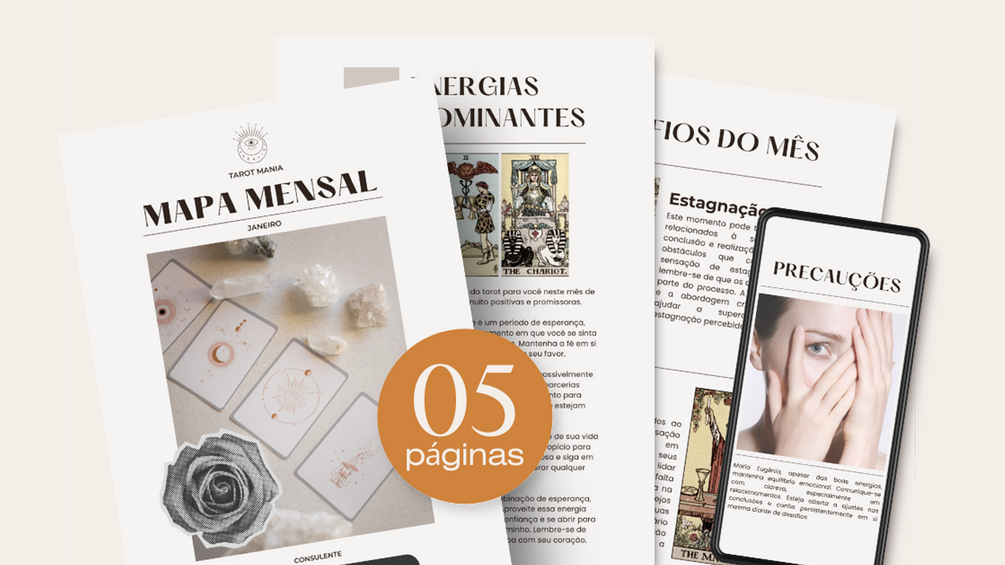 O nosso serviço exclusivo de Mapa Mensal é uma jornada personalizada para explorar as energias que moldarão o seu próximo mês. Através da sabedoria do Tarot, este mapa oferece insights valiosos para te orientar e permitir que você comece a enxergar caminhos abertos mesmo nas matas mais fechadas.